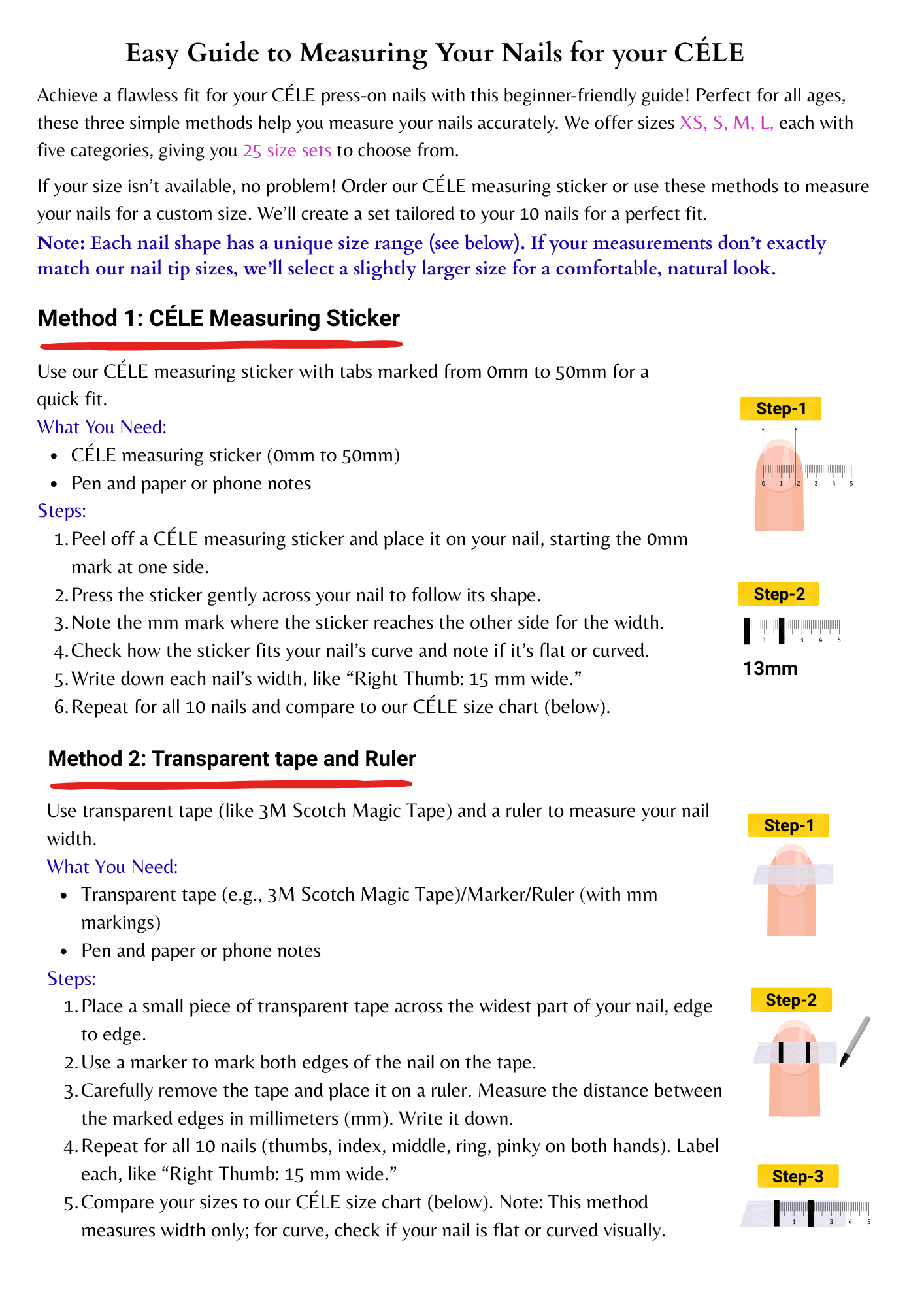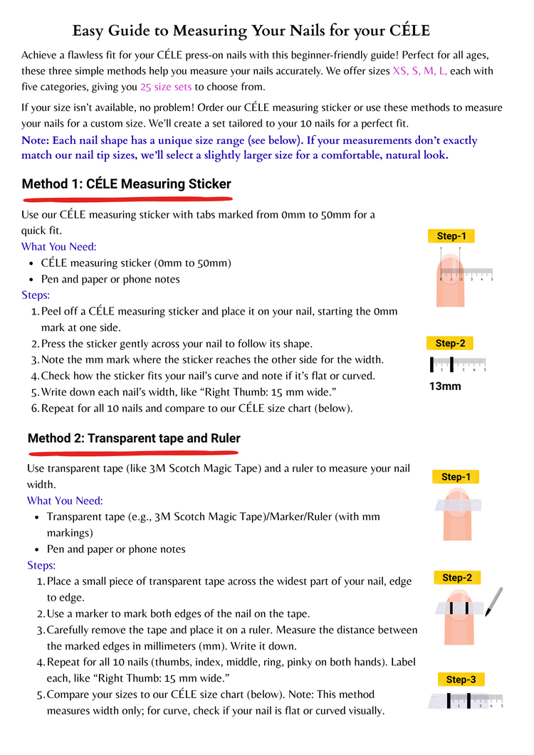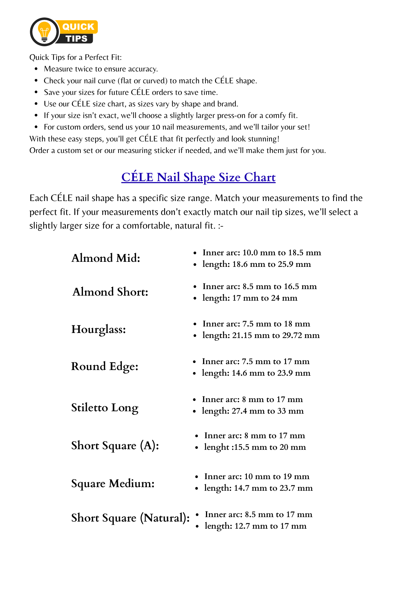 Please note that size charts relate to CELE own brand nails and are designed to fit to the following finger measurements.