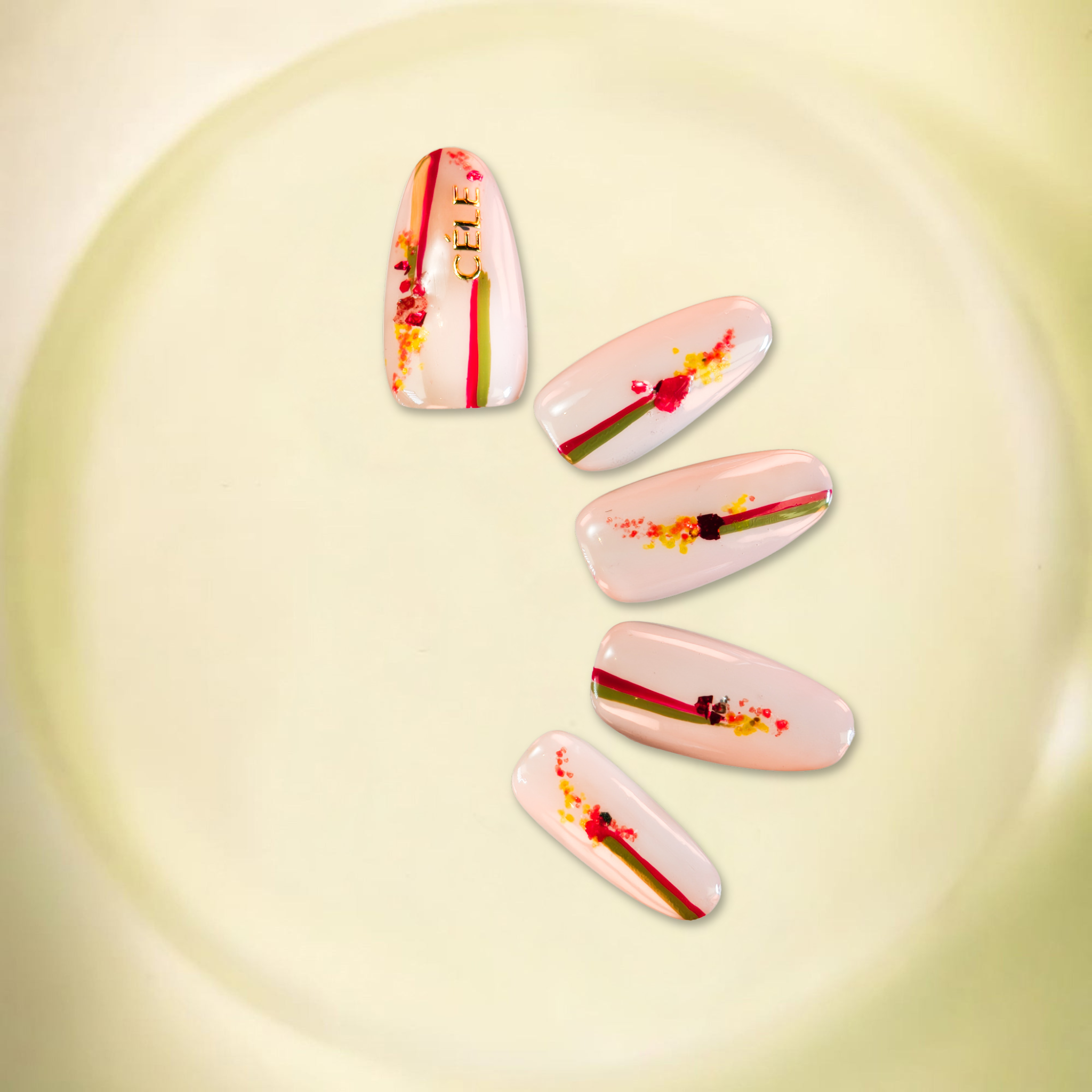 CÉLE-Speak Softly is a tender nail design with soft-touch details that evoke quiet elegance, available in versatile shapes and colors: milky yellow and cherry red for the smooth round edge, or milky yellow, cherry red, soft clay, and plaster pink for the sleek oval mid. This set is for the subtle influencers, the gentle souls, and those who let their style speak volumes in hushed tones.