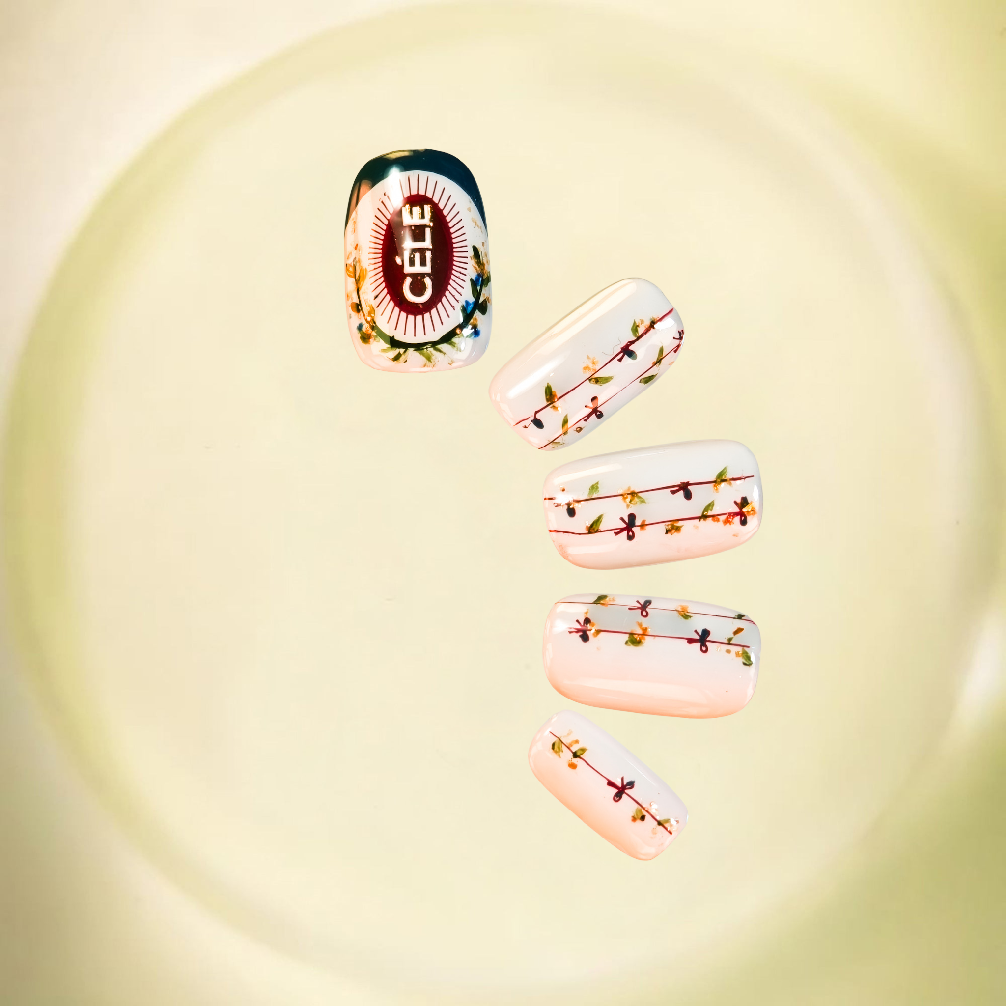 CÉLE - Spring Rhythm is a captivating nail collection with three unique designs, each with special details: sky blue layered with red and mist green for airy vitality, pink with warm brown for playful charm, or white with brown and navy blue for elegant harmony. This set is for the free spirits, the season lovers, and those who move to life's joyful rhythms.